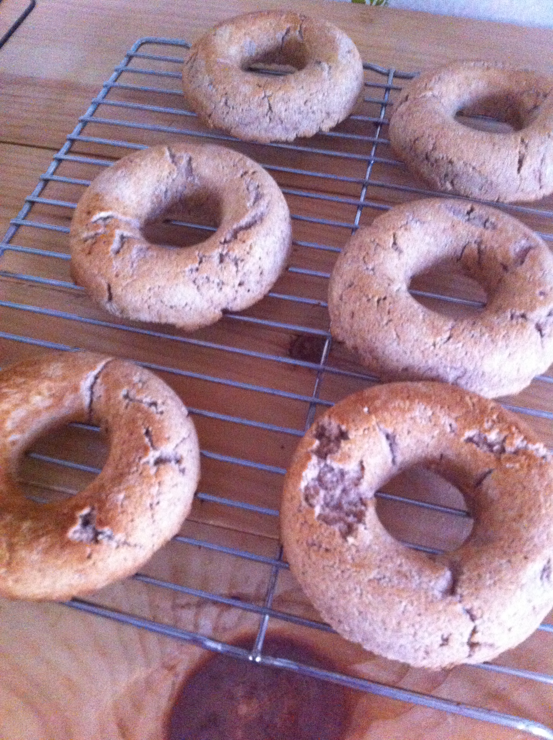 Fill your doughnut pan and bake at 350 degrees. If you don’t have a doughnut pan, you can shape the dough and cook it on a cookie sheet. See – no excuses!! You can make it work if you want to make it work!! Bake for about 15 minutes or until they start to brown. If they are browning but still more moist than you would like them to be, try putting the baked doughnuts on a wire rack and putting them back in the oven on a cookie sheet. The coconut fiber can be really dense, which I like in my doughnuts, but others prefer a lighter doughnut.