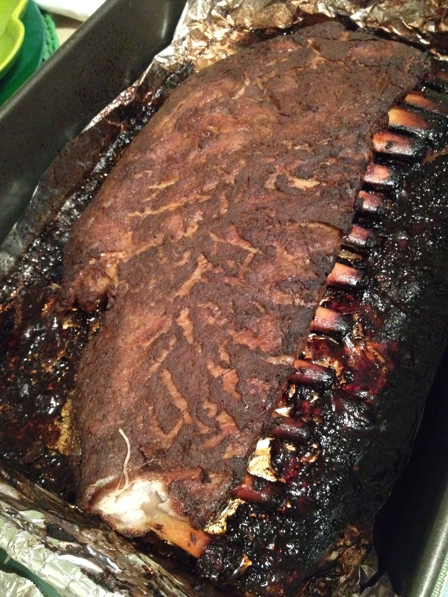 In a small saucepan, combine everything but the ribs. Stir well and bring to a simmer. Remove it from the heat right after it starts simmering. Preheat the oven to 250 degrees Fahrenheit. Line a roasting pan with aluminum foil and lay the ribs in the pan. If you have a meat injector, inject some of the sauce into the meat. My injector cracked… Very sad face… So I just skipped to the next step and slathered half of the sauce on the bottom side of the ribs. Cover the pane with another piece of foil, and put it in the oven. In one hour, take out the ribs and flip them. Slather the rest of the sauce on the other side f the ribs, cover them and out them back in the oven. Forget about them for about 3 1/2 hours.
